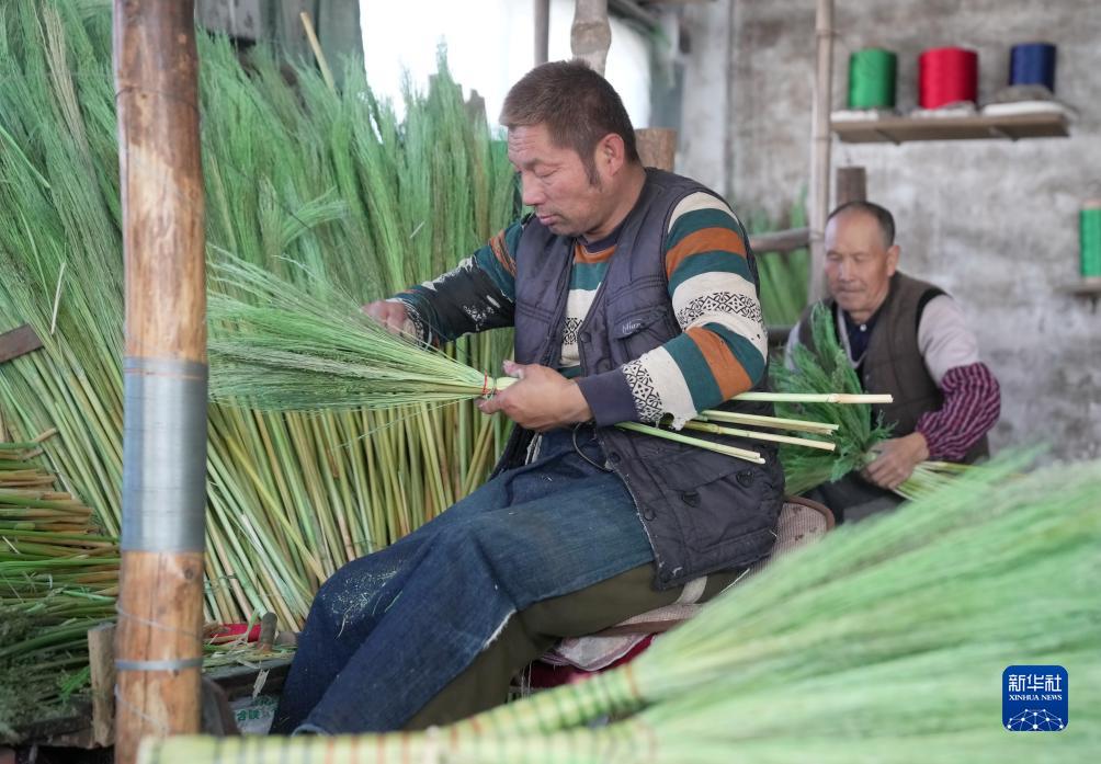 11月21日,河北省樂(lè )亭縣毛莊鎮一家笤帚專(zhuān)業(yè)合作社的社員在制作笤帚。