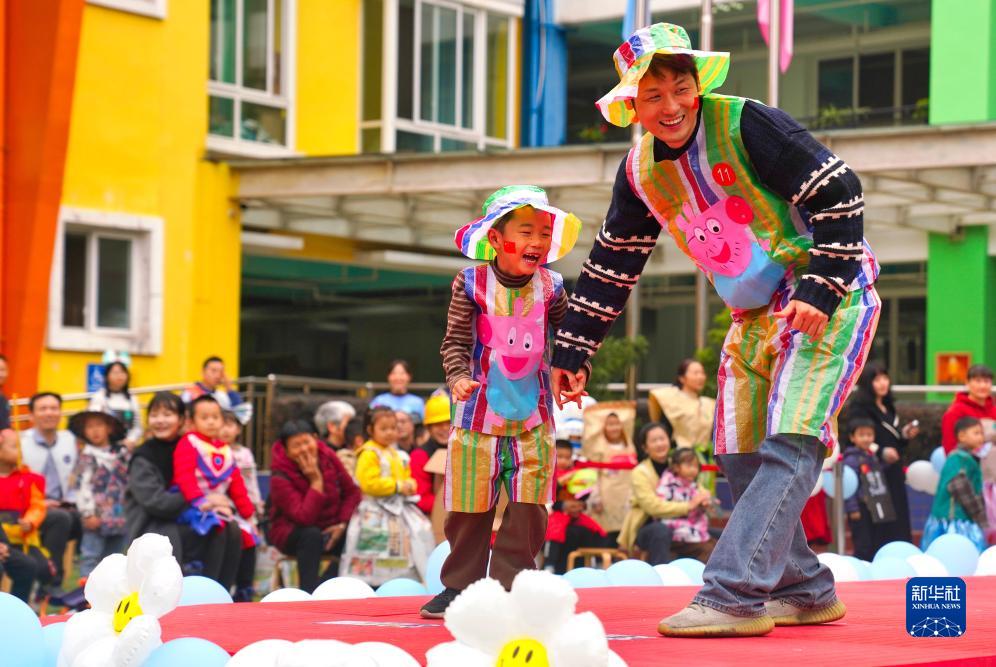 11月21日,在瀘州市龍馬潭區玉帶河幼兒園內,小朋友和家長(cháng)展示用舊材料制作的創(chuàng )意服裝。