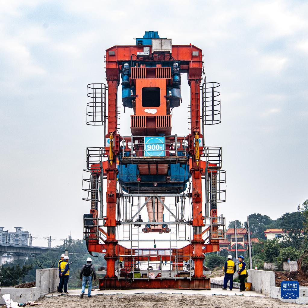 11月21日,在渝昆高鐵川渝段樓灣特大橋建設施工現場(chǎng),施工人員進(jìn)行箱梁架設作業(yè)。