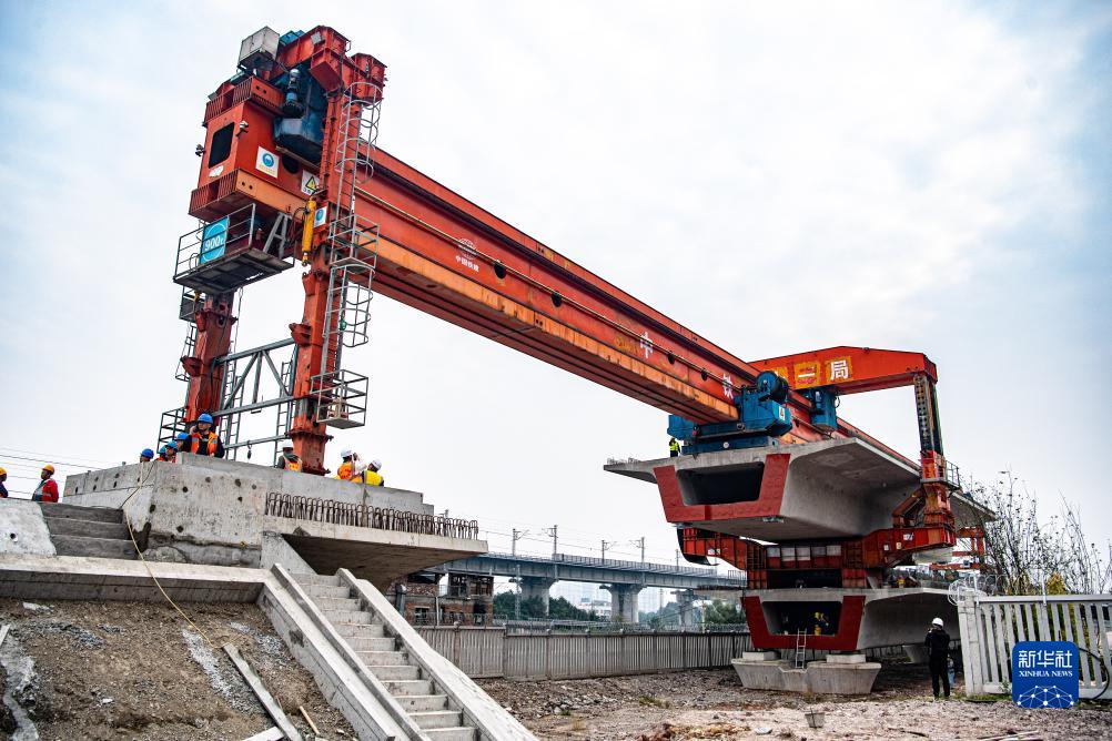 11月21日,在渝昆高鐵川渝段樓灣特大橋建設施工現場(chǎng),施工人員進(jìn)行箱梁架設作業(yè)。