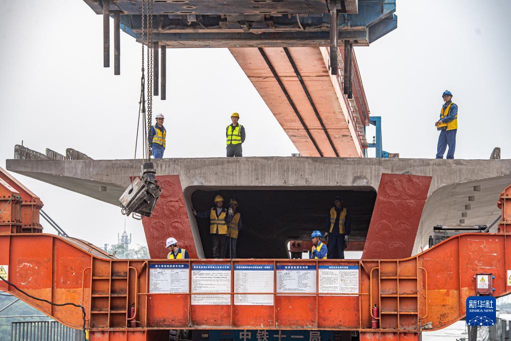 11月21日,在渝昆高鐵川渝段樓灣特大橋建設施工現場(chǎng),施工人員進(jìn)行箱梁架設作業(yè)。