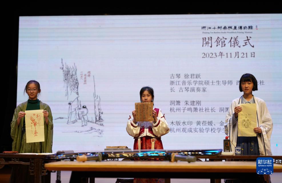 當日,浙江十竹齋版畫(huà)博物館開(kāi)館儀式在杭州觀(guān)成實(shí)驗學(xué)校舉行。博物館內舉辦的十竹齋藝術(shù)文獻作品展,共展出珍貴木版水印作品、雕版1100多件以及珍貴歷史文獻實(shí)物資料上百件。
