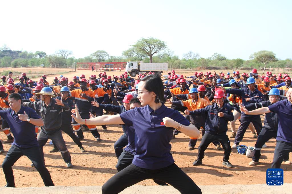11月21日,在津巴布韋南部邊境地區的新太資源棕櫚河冶金產(chǎn)業(yè)園,中國醫療隊隊員帶領(lǐng)中企員工做八段錦。