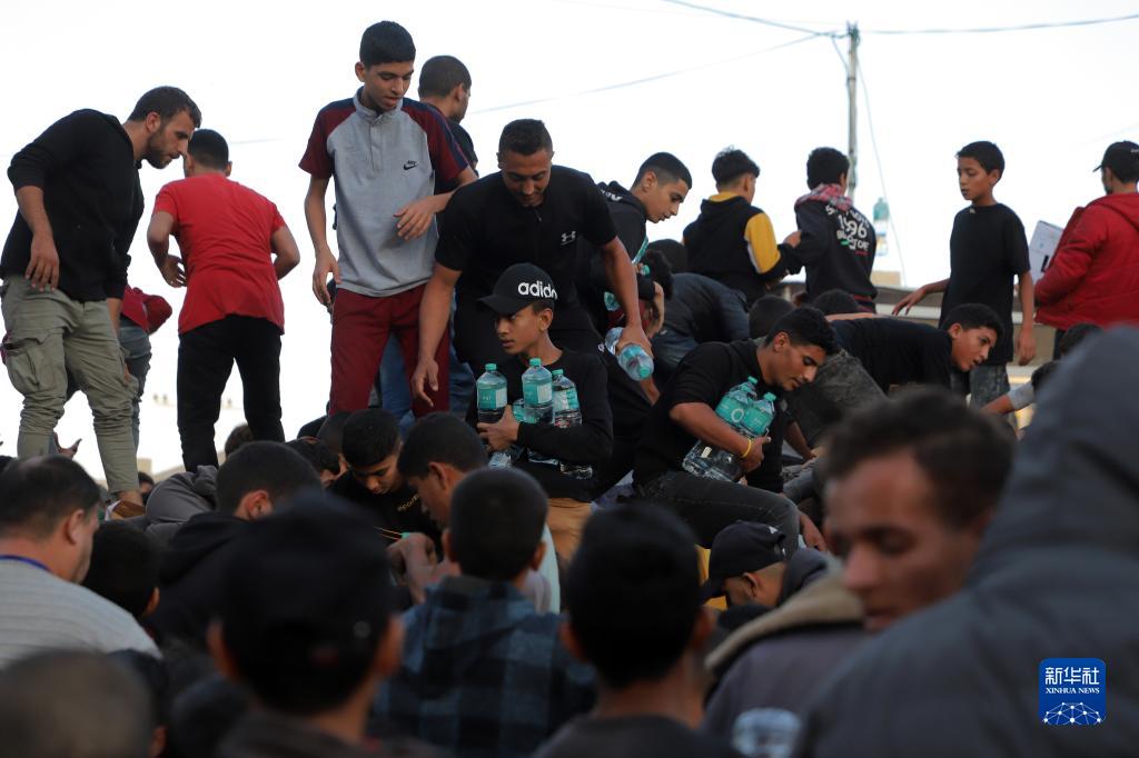 11月21日,在加沙地帶南部城市汗尤尼斯,民眾領(lǐng)取飲用水。