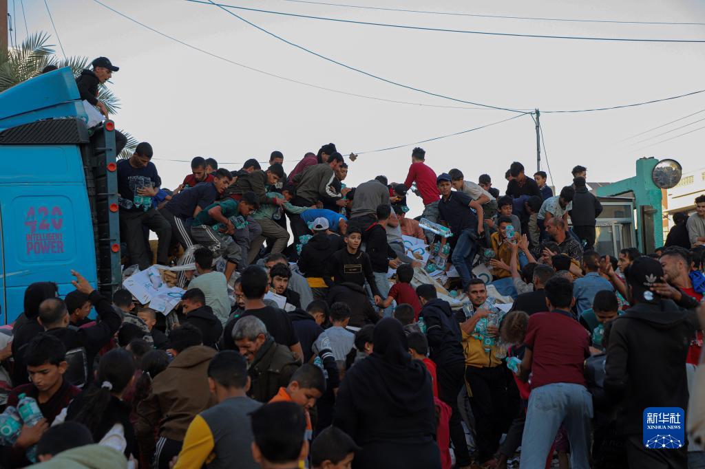 11月21日,在加沙地帶南部城市汗尤尼斯,民眾領(lǐng)取飲用水。