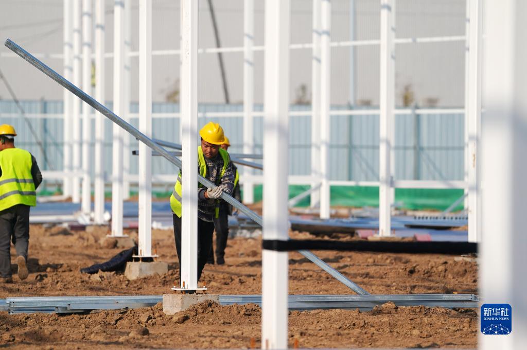 工人在進(jìn)行饒陽(yáng)縣農村產(chǎn)業(yè)融合發(fā)展示范園項目施工(11月20日攝)。