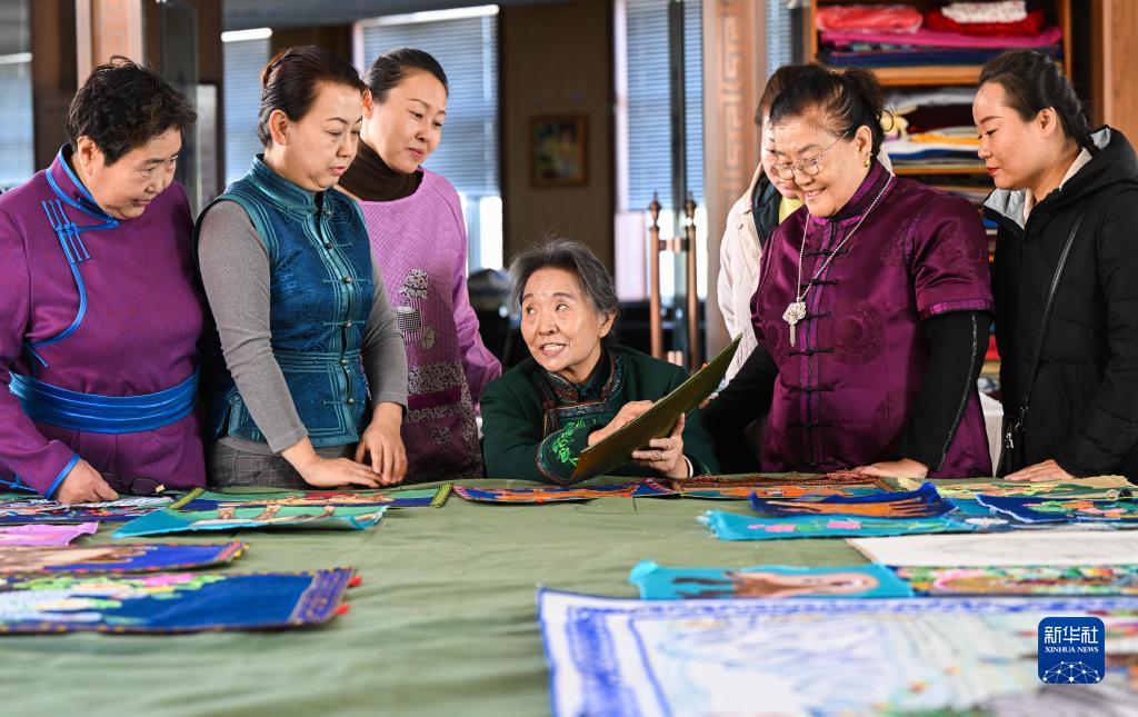 11月16日,在內蒙古阿拉善盟阿拉善左旗的馬鬃繞線(xiàn)蒙古族唐卡傳習所,陶格日勒(中)向農牧民傳授制作技藝。