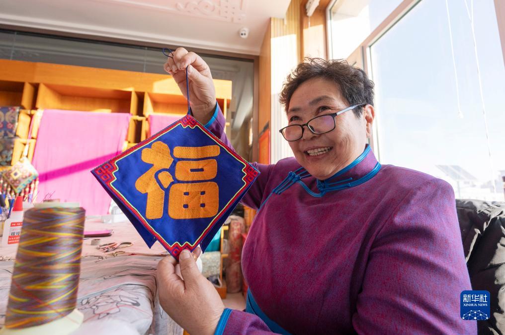 11月16日,在內蒙古阿拉善盟阿拉善左旗的馬鬃繞線(xiàn)蒙古族唐卡傳習所,一名牧民展示自己制作的蒙古族唐卡。