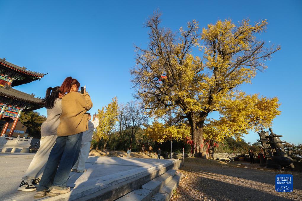 11月21日,游客在觀(guān)賞拍攝諸暨市店口鎮杭塢山頂的古銀杏樹(shù)。