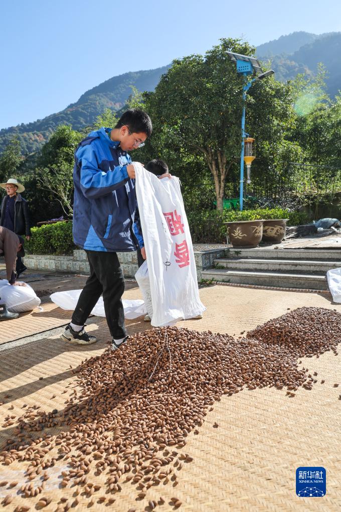 11月22日,學(xué)生在趙家鎮花明泉村明樂(lè )果業(yè)實(shí)踐基地幫助果農曬香榧。
