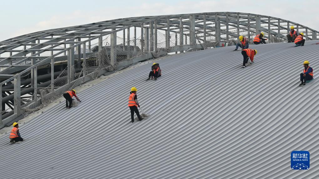 中鐵十一局的工人在鋪設玉林北站站房的金屬屋面(11月22日攝)。