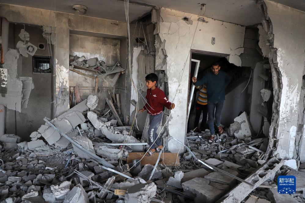 11月22日,在加沙地帶南部城市汗尤尼斯,巴勒斯坦人查看遭以色列襲擊后的建筑廢墟。