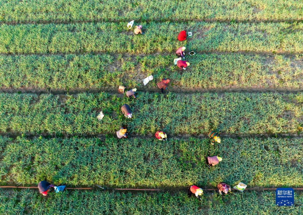 11月22日,農民在江蘇省興化市興東鎮東鮑村香蔥種植基地給香蔥除草(無(wú)人機照片)。