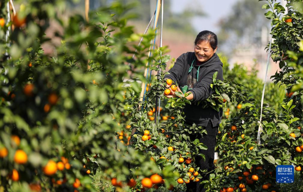 11月22日,在四川省宜賓市高縣羅場(chǎng)鎮陳村村,村民在果園里采摘柑橘。