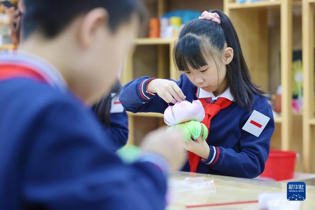 11月22日,河北省霸州市勝芳鎮紅光小學(xué)的學(xué)生在學(xué)習制作勝芳花燈。