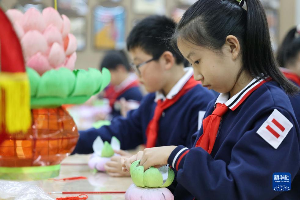 11月22日,河北省霸州市勝芳鎮紅光小學(xué)的學(xué)生在學(xué)習制作勝芳花燈。