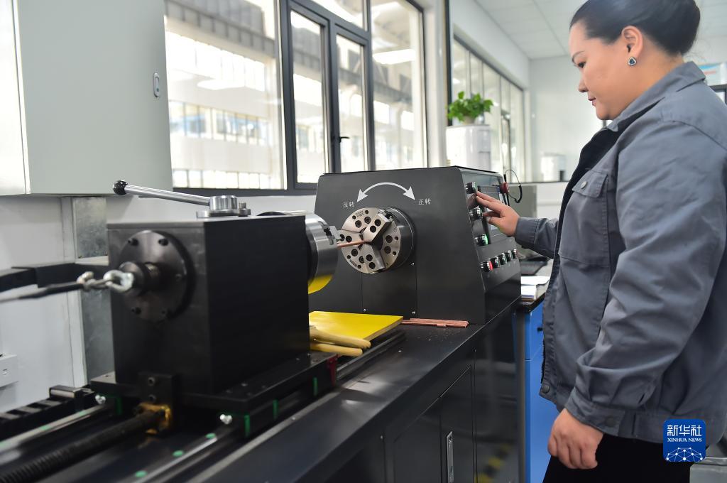11月22日,在江西鷹潭鼎辰科技有限公司實(shí)驗室,技術(shù)人員對銅桿進(jìn)行扭轉測試。