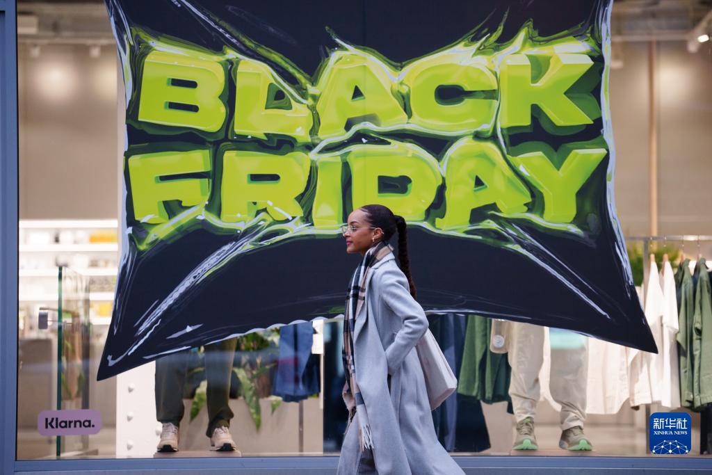 11月22日,在英國曼徹斯特,一名女子走過(guò)“黑色星期五”促銷(xiāo)廣告。