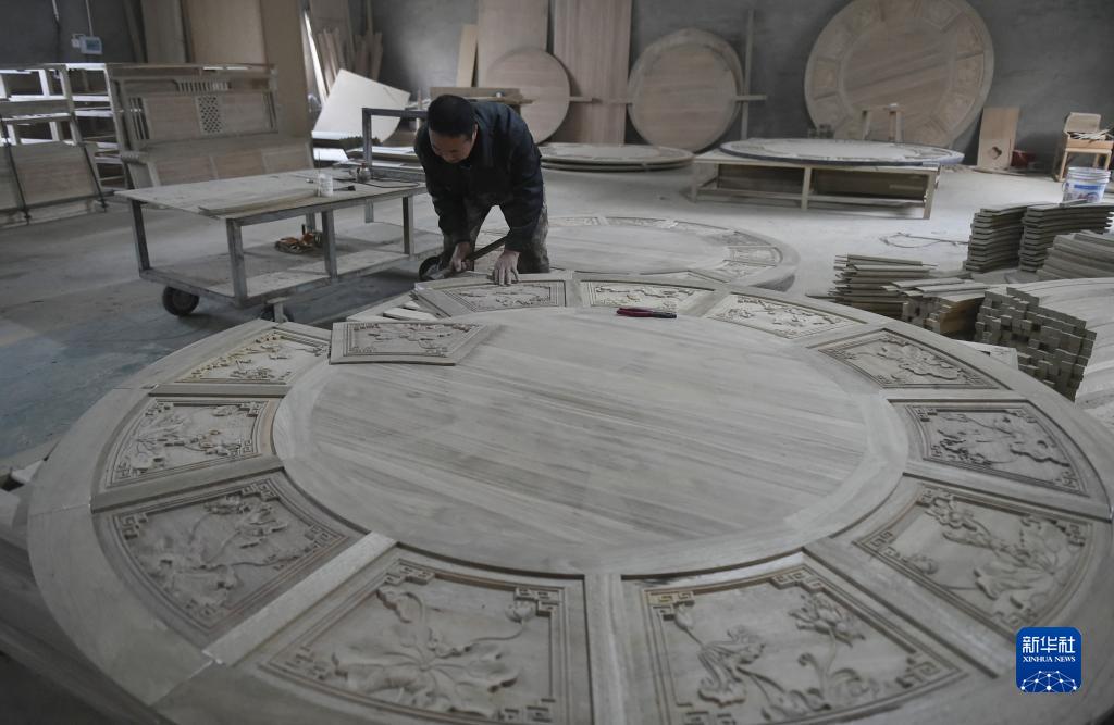 11月22日,工人在滑縣半坡店古典家具特色小鎮內一家企業(yè)的生產(chǎn)車(chē)間制作家具。