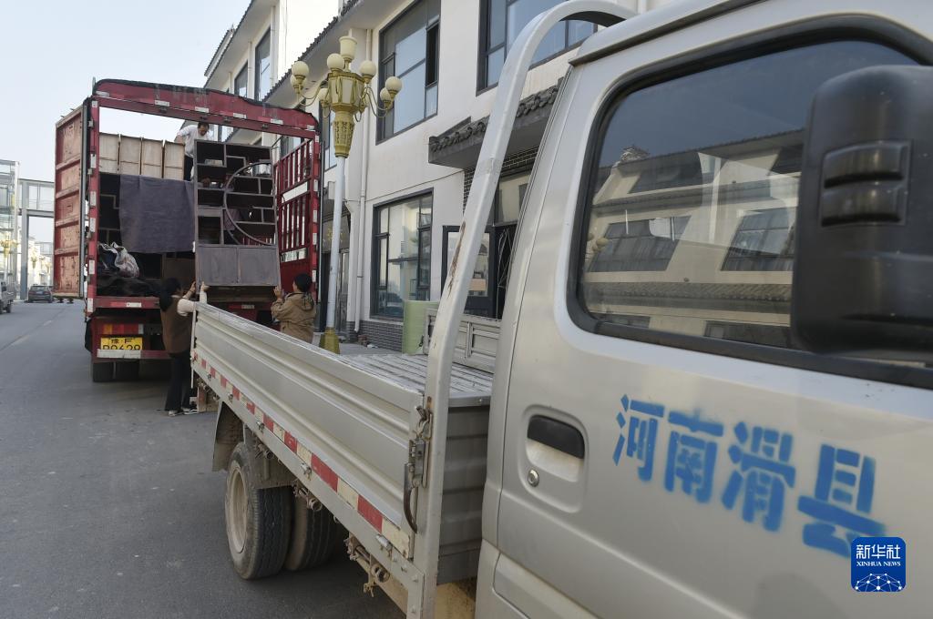 11月22日,在滑縣半坡店古典家具特色小鎮,商戶(hù)將家具裝車(chē)準備外銷(xiāo)。