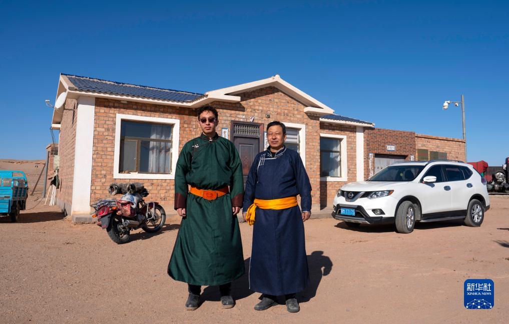 在內蒙古阿拉善左旗烏力吉蘇木溫都爾毛道嘎查,牧民朝勒門(mén)格爾勒(右)和兒子溫都蘇在家門(mén)口合影(11月17日攝)。