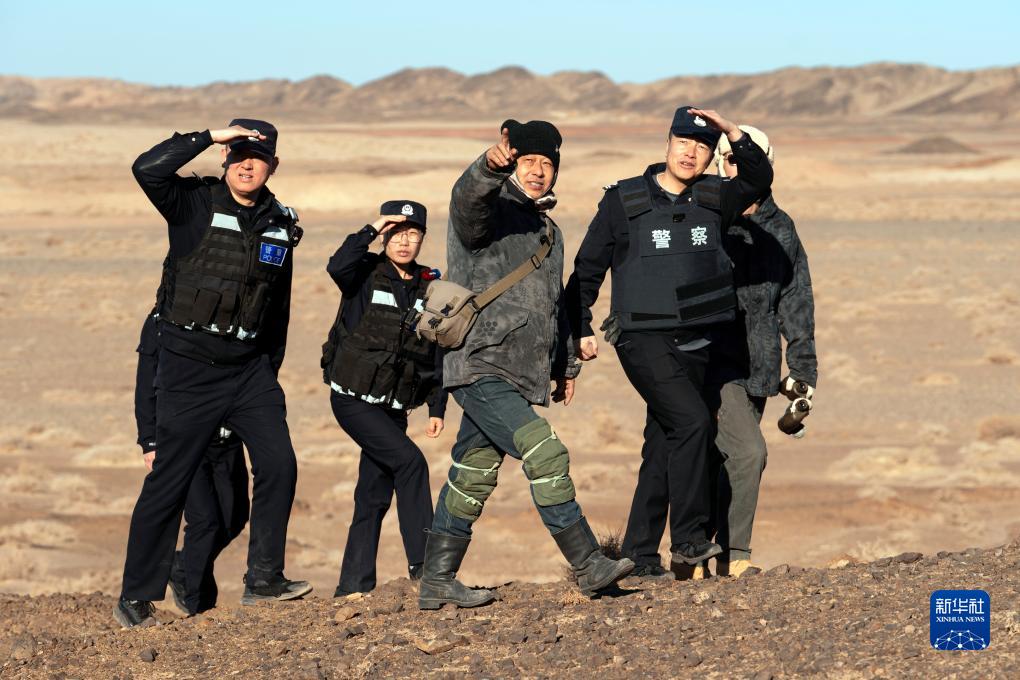 在內蒙古阿拉善左旗烏力吉蘇木溫都爾毛道嘎查,牧民朝勒門(mén)格爾勒(中)與阿拉善左旗邊境管理大隊的民警在邊境地區巡護(11月17日攝)。