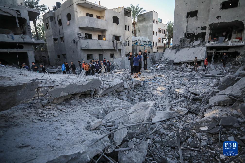 11月23日,在加沙地帶中部的代爾拜拉赫,巴勒斯坦人查看以軍空襲后的建筑廢墟。