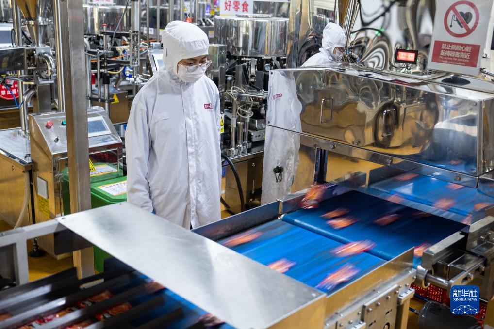 11月23日,在鹽津鋪子瀏陽(yáng)生產(chǎn)基地,成品正在通過(guò)X光機進(jìn)行異物檢測。