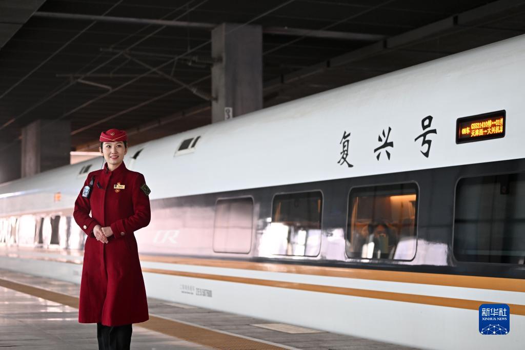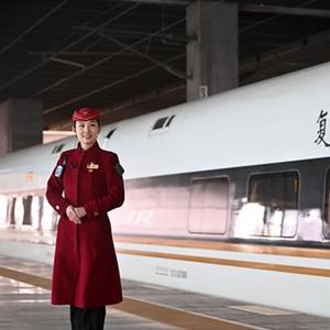 11月23日,列車(chē)長(cháng)在運行試驗車(chē)前演練候客。