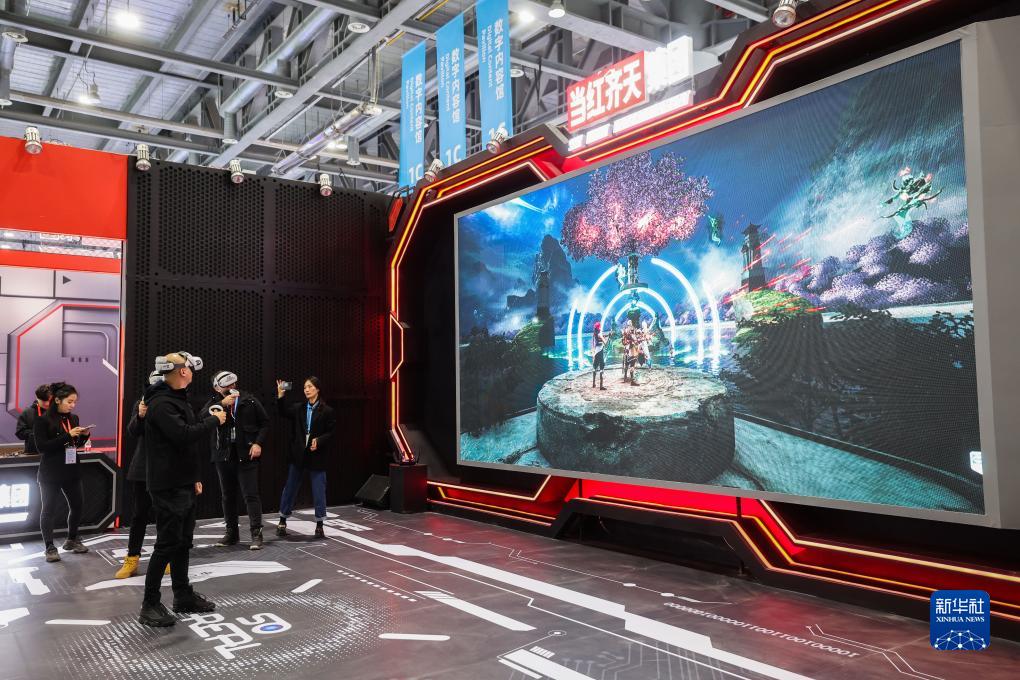 11月23日,觀(guān)眾在第二屆全球數字貿易博覽會(huì )數字內容館體驗應用虛擬現實(shí)技術(shù)的游戲。