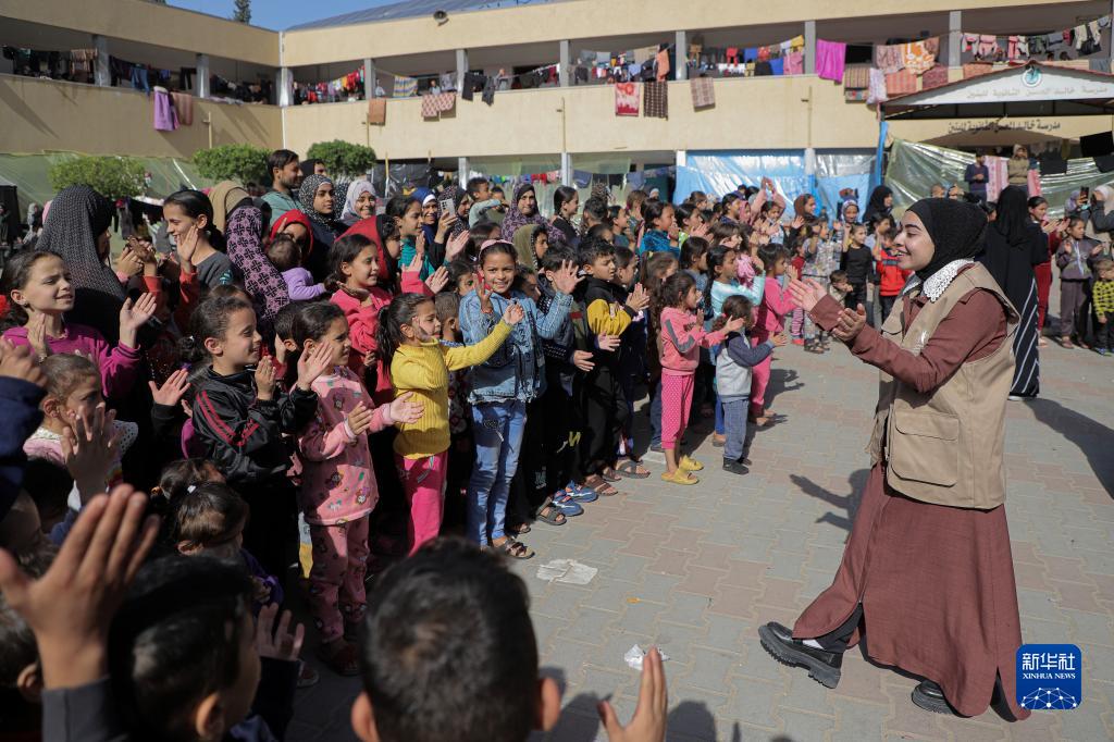 這是11月23日在加沙地帶南部城市汗尤尼斯拍攝的與當地志愿者互動(dòng)的兒童。