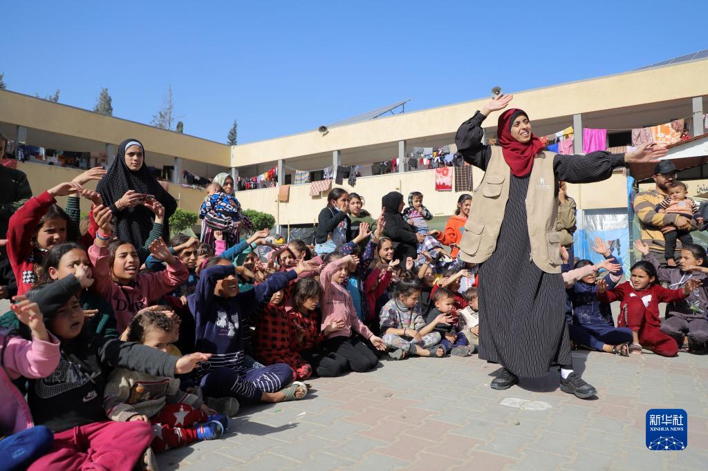 11月23日,在加沙地帶南部城市汗尤尼斯,當地志愿者和兒童進(jìn)行互動(dòng)。