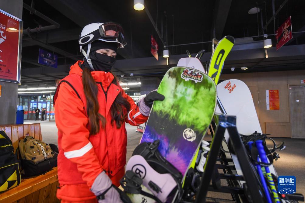 11月23日,在北大湖滑雪度假區,王雪在取雪板。