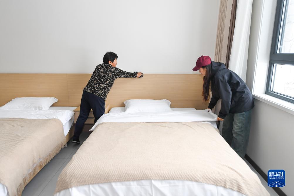 11月23日,在吉林省吉林市永吉縣北大湖鎮南溝村,王雪(右)與母親一起整理自家民宿的床鋪。