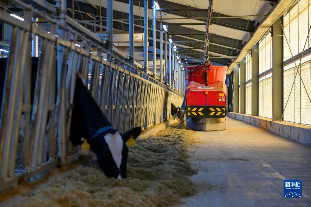 11月23日,在呼和浩特市伊利敕勒川生態(tài)智慧牧場(chǎng),機器人在添加飼料。