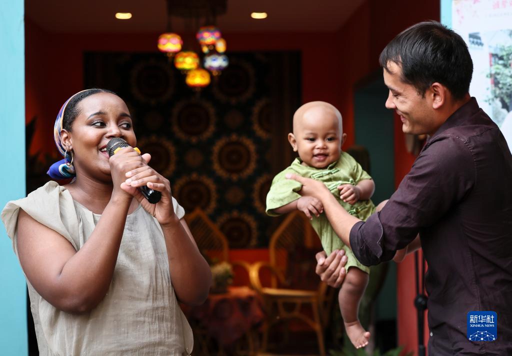 新疆喀什古城“迪力和迪雅”咖啡館前,坦桑尼亞姑娘海迪雅為游客演唱,她的丈夫喀什小伙迪力夏提·吐?tīng)栠d抱著(zhù)孩子與妻子互動(dòng)(9月7日攝)。