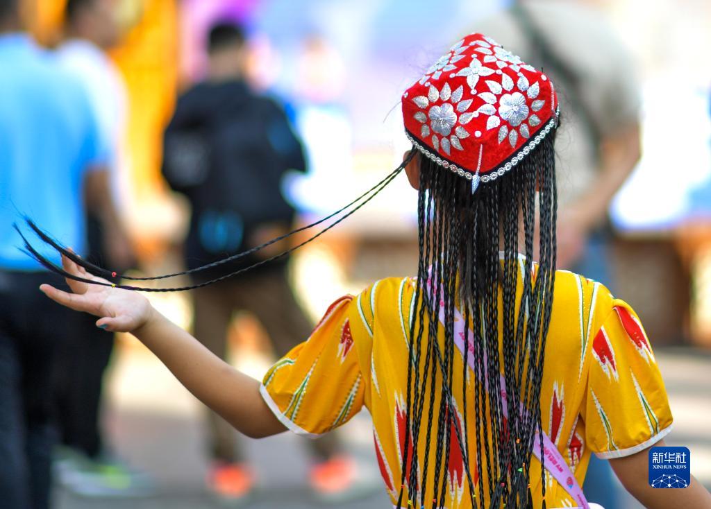 烏魯木齊市新疆國際大巴扎,一名小游客在游覽觀(guān)光(8月16日攝)。