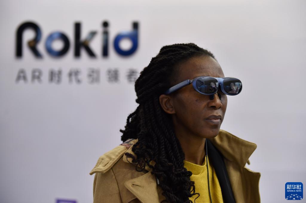 11月24日,在第二屆全球數字貿易博覽會(huì )數字技術(shù)館,一名觀(guān)眾體驗靈伴科技的AR眼鏡設備。