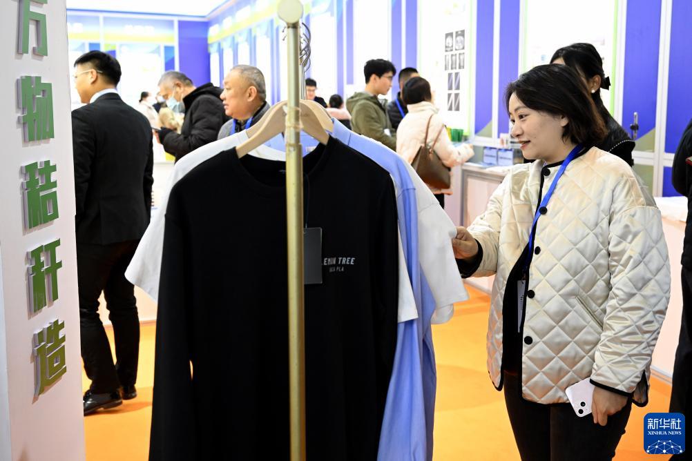 11月24日,在第三屆國際新材料產(chǎn)業(yè)大會(huì )展覽上,觀(guān)眾在參觀(guān)由秸稈加工制作成的衣服。