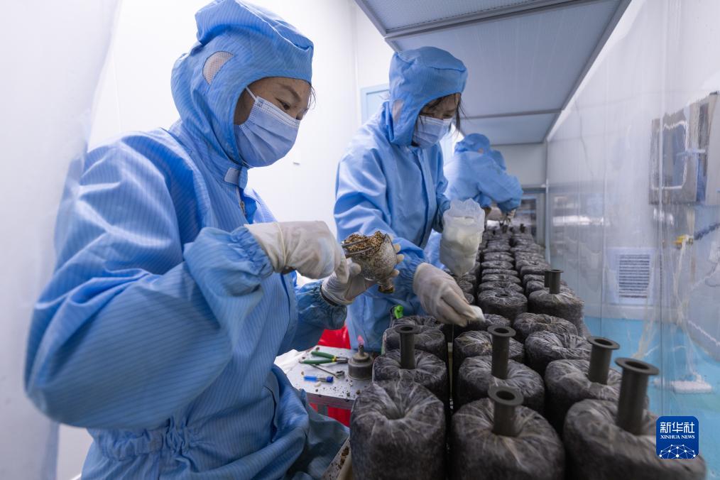 11月23日,在湖北省羅田縣九資河鎮葫蘆石村,技術(shù)人員在無(wú)菌室對天麻菌種進(jìn)行液體接種。