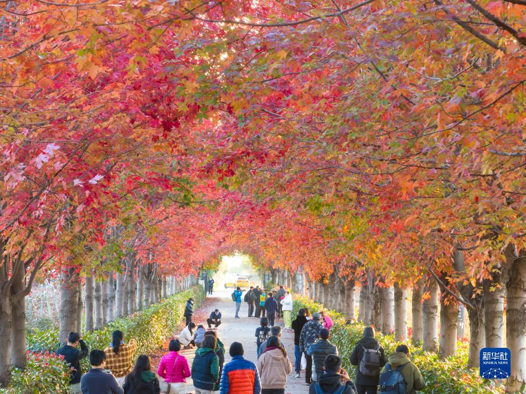 11月24日,游客在江蘇省蘇州市工業(yè)園區一處農業(yè)園的紅楓大道賞楓(無(wú)人機照片)。