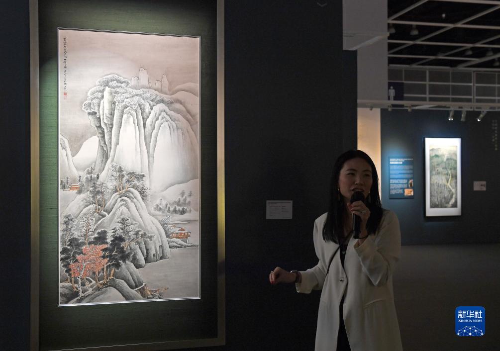 11月24日,在香港會(huì )議展覽中心,導賞員講解張大千作品《關(guān)山密雪圖》。