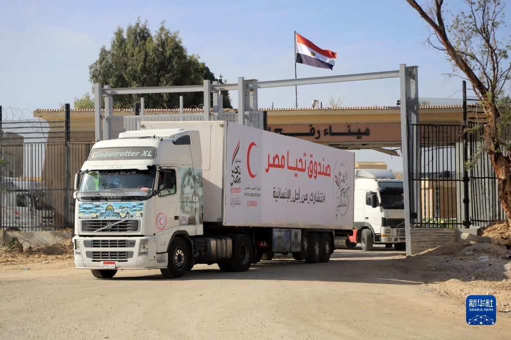 11月24日,運送救援物資的卡車(chē)進(jìn)入拉法口岸加沙一側。