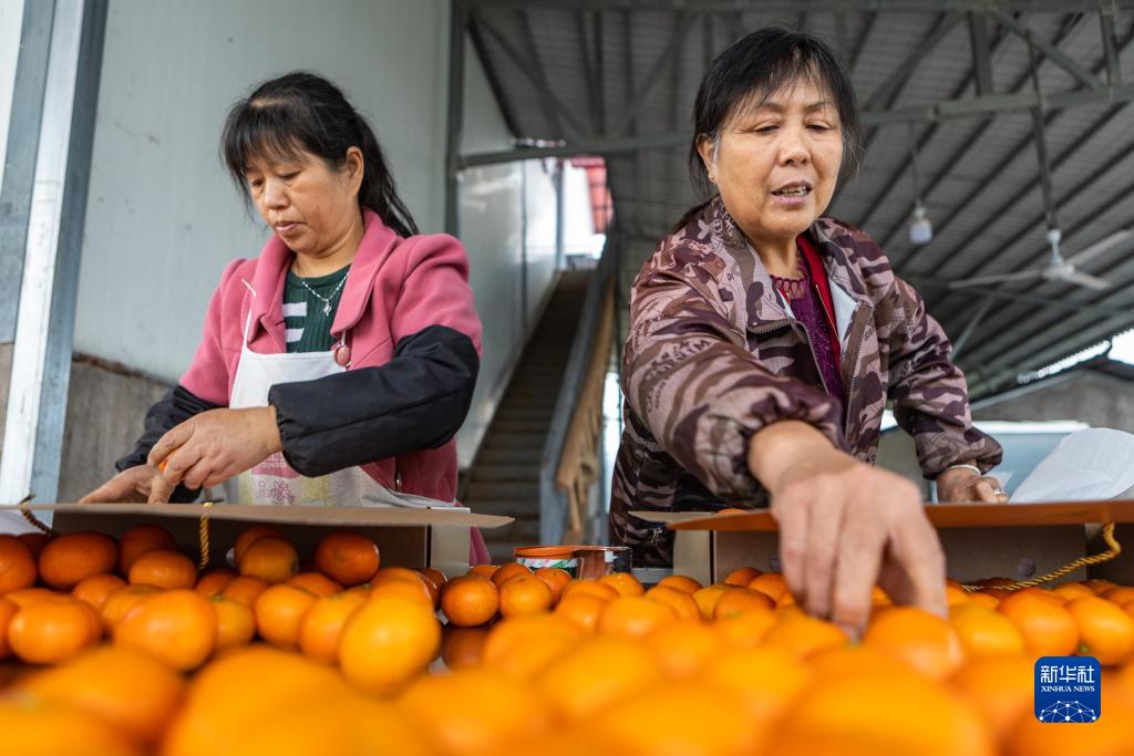 11月24日,在重慶市開(kāi)州區竹溪鎮大海村的一個(gè)柑橘種植基地,村民在將采摘的砂糖橘裝盒。