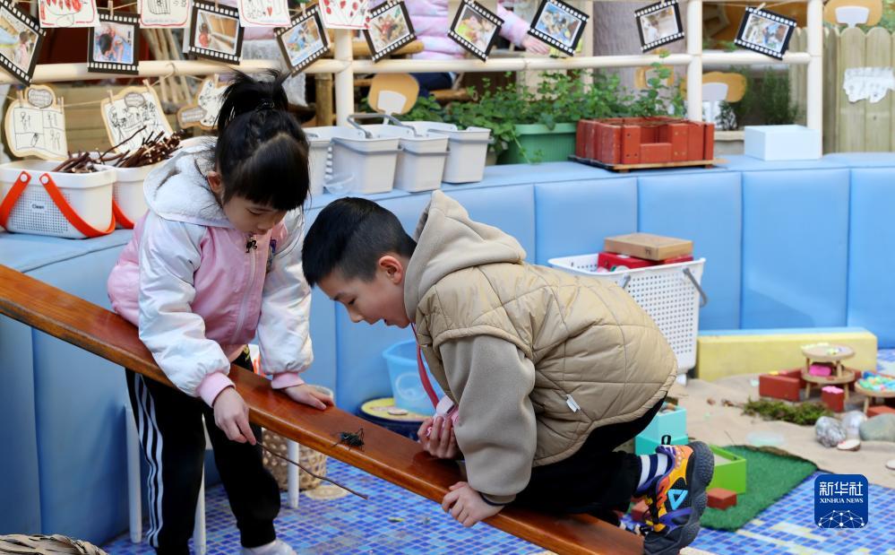 11月24日,在上海市實(shí)驗幼兒園,小朋友近距離觀(guān)察一只蟈蟈。