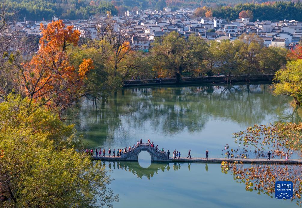 11月25日,游客在黃山市黟縣宏村南湖游覽(無(wú)人機照片)。