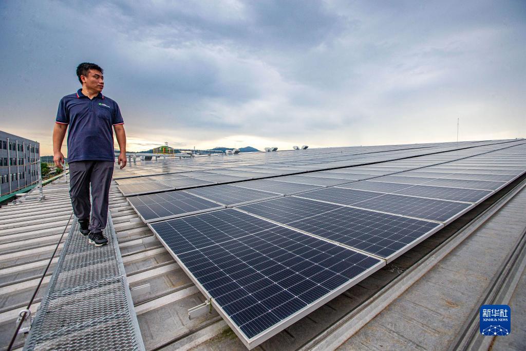 11月7日,在泰國春武里府,工作人員在工廠(chǎng)屋頂光伏發(fā)電項目現場(chǎng)查看。