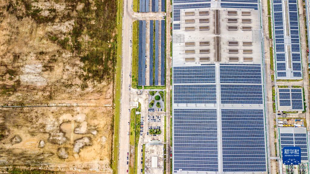 這是11月7日在泰國春武里府拍攝的工廠(chǎng)屋頂光伏發(fā)電項目現場(chǎng)(無(wú)人機照片)。