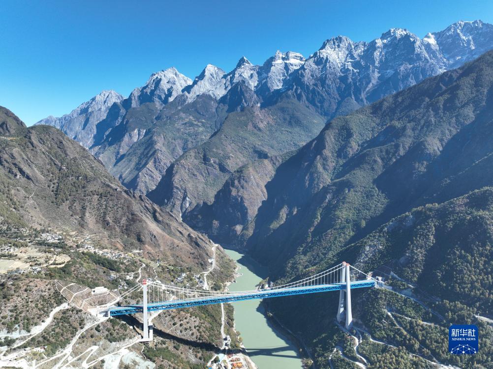 11月26日,列車(chē)駛過(guò)虎跳峽金沙江鐵路大橋(無(wú)人機照片)。