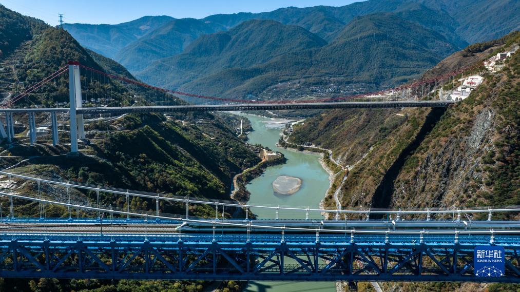 11月26日,列車(chē)駛過(guò)虎跳峽金沙江鐵路大橋(無(wú)人機照片)。